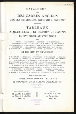 Catalogue des cadres anciens : époques Renaissance, Louis XIII à Louis XVI : tableaux : aquarelles, gouaches, dessins du XVIe siècle au XVIIIe siècle : par Boyer, P. Brebiette, S. Challe, A.-F. Desportes [und weiteren] : et des XIXe et XXe siècles : par P.-A. Besnard, P. Bompard, P. Bonnard, R.-T. Bosshard, G. Bouche [und weiteren] : dont la vente aura lieu à Paris, Hôtel Drouot, Salle No 6, le vendredi 8 et le samedi 9 décembre 1933 / commissaire-priseur: Alph. Bellier ; expert Jean Cailac