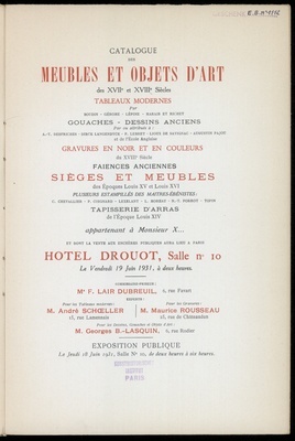 Catalogue des meubles et objets d'art : des XVIIe et XVIIIe siècles : tableaux modernes : par Boudin, Gérome, Lépine, Marais et Richet : gouaches, dessins anciens : par ou attribués à: A.-T. Desfriches, Dirck Langendyck, F. Lebret, Lioux de Savignac, Augustin Pajou et de l'´'Ecole anglaise : gravures en noir et en couleurs du XVIIIe siècle : faïences anciennes : sièges et meubles des Époques Louis XV et Louis XVI : plusieurs estampillés de Maître-ébénistes: C. Chevallier, P. Coignard, Lexelant [und weiteren] : tapisserie d'Arras de l'Époque Louis XIV : appartenant à Monsieur X... : et dont la vente aux enchères publiques aura lieu à Paris, Hôtel Drouot, Salle No 10, le vendredi 19 juin 1931 / commissaire-priseur: F. Lair Dubreuil ; experts: Pour les tableaux modernes: André Schœller, pour les gravures: Maurice Rousseau, pour les dessins, gouaches et objets d'art: Georges B.-Lasquin