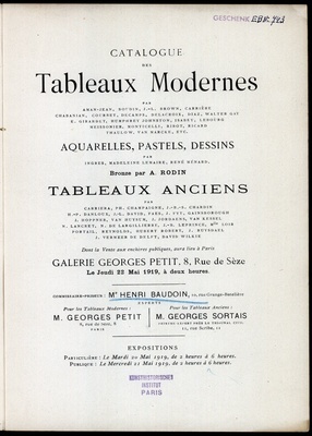 Catalogue de tableaux modernes : par Berne-Bellecour, J.-L. Brown, Chaplin, Chavet [und weiteren] : dessins, aquarelles, pastels : tableaux anciens : objets d'art, tapisseries : dont la vente par suite de décès, aura lieu Galerie Georges Petit, 8, rue de Sèze, le mardi 8 mai 1900 / commissaire-priseur Paul Chevallier ; experts pour les tableaux modernes Georges Petit, pour les tableaux anciens G. Sortais, pour les objets d'art M.M. Mannheim