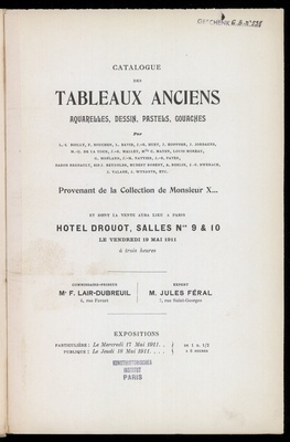 Catalogue de dessins, tableaux et esquisses : tableaux anciens, meubles et objets d'art, faiences dépendant de la succession de madame veuve J. F. Millet et dont la vente aura lieu à Paris, Hôtel Drouot... les 24 et 25 Avril 1894 / par J. F. Millet