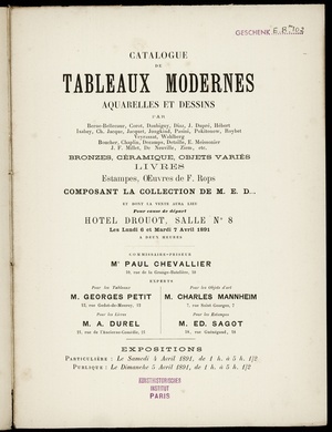 Collection de feu M. Dobbé : Catalogue de tableaux de l'école moderne, œuvres de H. Baron, Berne-Bellecour, Rosa Bonheur ..., aquarelles et dessins par Berne-Bellecour, Bonvin, Detaille ..., tableaux anciens, dont la vente aura lieu à Paris, Hotel Drouot, les lundi 18 et mardi 19 février / par le ministère de Me Couturier, commissaire-priseur ...