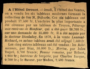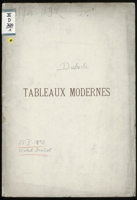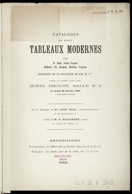 Catalogue de beaux tableaux modernes par N. Diaz, J. Dupré Hérbert, C. Jacque, Madou, Troyon, provenant de la collection de feu M. D *** [i.e. Dubarle] dont la vente aura lieu Hotel Drouot le jeudi 25 février 1892 / par le ministère de Léon Tual, commissaire-priseur ...
