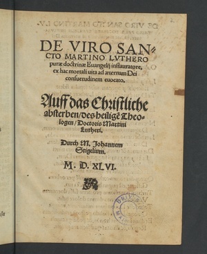 De viro sancto Martino Luthero, purae doctrinae Evangelii instauratore, ex hac mortali vita ... evocato / durch M. Johannem Stigelium
