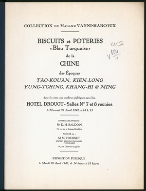 Collection de M. Tchao Itao, ancien Consul Géneral de Chine, Paris : Objets d'art d'Extrême-Orient, peintures sur soie, importante suite de pierres dure des XVIIe et XVIII siècles, céramique, émaux cloisonnes, bronzes, bois sculptés ce la Chine et du Japon, tableaux modernes par Barucci ... ; vente Hotel Drouot, 16 avril 1942 / commissaire-priseur D.-H. Baudoin ...