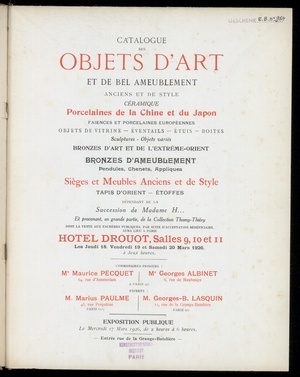 Catalogue des objets d'art et d'ameublement, porcelaines de la Chine et du Japon, boîtes, montres, objets de vitrine du XVIIIe siècle ..., sièges et meubles ..., tableaux anciens et modernes ..., composant la collection de feu M. Georges Martini et dont la vente aura lieu à Paris, Hotel Drouot, les lundi 20, mardi 21 et mercredi 22 février 1911 / commissaire-priseur Georges Ridel ...