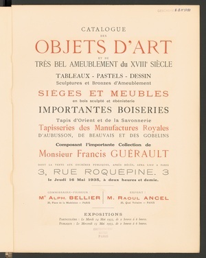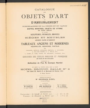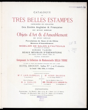 Catalogue des objets d'art et d'ameublement, tableaux anciens, aquarelles, dessins, gouaches, pastels de l'École Française du XVIIIe siècle ..., faiences, porcelaines et objets variés..., bronzes d'ameublement..., meubles du XVIIIe siècle... composant la collection de M. Allard de Meeus ; dont la vente aura lieu à Paris, Galerie Georges Petit les lundi 6 et mecredi 7 juin 1910 / commissaire-priseur F. Lair-Dubreuil