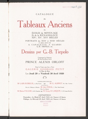 Catalogue des tableaux anciens des écoles du moyen-age et de la renaissance, XIVe, XVe, XVIe siècles, portraits des XVIIe et XVIIIe siècles et autres œuvres de A. Canaletto, F. Guardi, G.-B. Tiepolo, etc : dessins par G.-B. Tiepolo, composant la collection de son Excellence feu le prince Alexis Orloff, dont la vente aura lieu à Paris, Galerie Georges Petit, les jeudi 29 et vendredi 30 avril 1920 / commissaires-priseurs Me Lair-Dubreuil ...