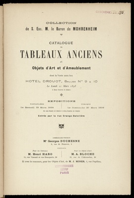 Catalogue des objets d'art anciens (première partie), tableaux, dessins, gravures, sculptures, bronzes d'ameublement - objets variés, coffrets en cuir des XVe et XVIe siècles, sièges et meubles ... : le tout dépendant de la succession de feu M. le Baron H. de Bethmann et dont la 4e vente après son décès aura lieu à Paris, Hotel Drouot, les jeudi 21 et vendredi 22 juin 1923 / commissaires-priseurs F. Lair-Dubreuil ...
