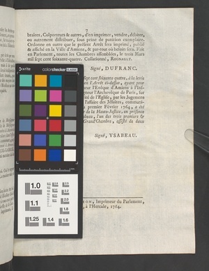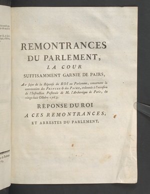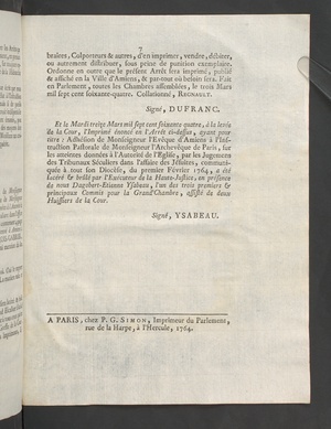 Arrest De La Cour De Parlement, Qui condamne un Imprimé ayant pour titre: Adhésion de Monseigneur l'Evêque d'Amiens, à l'Instruction Pastorale de Monseigneur l'Archevêque de Paris, sur les atteintes données à l'Autorité de l'Eglise, par les Jugemens des Tribunaux Séculiers dans l'affaire des Jésuites, communiquée à tout son Diocèse, en date du premier Février 1764, à être lacéré & brûlé par l'Exécuteur de la Haute-Justice : Extrait Des Registres Du Parlement. Du trois Mars 1764.