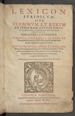 Lexikon juridicum, sive verborum et rerum ad juris Rom. civilis simul et pontificii theoriam et praxim pertinentium thesaurus locupletiss / Simonis Schardii ... Opus nunc denuo studio et opera doctorum virorum ... adauctum, elimatum, & ... absolutum ... Adjecta quoque passim phravis Germanica, a practicis juris hodie recepta