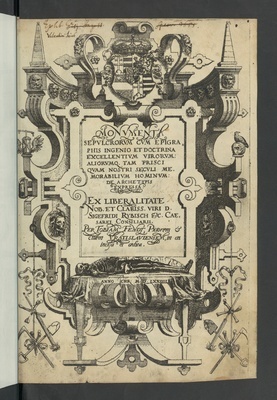 Monumenta sepulcrorum cum epigraphis ingenio et doctrina excellentium virorum aliorumque tam prisci quam nostri seculi memorabilium Hominum : de archetypis expressa ... in aes incisa et aedita / Tobias Fendt