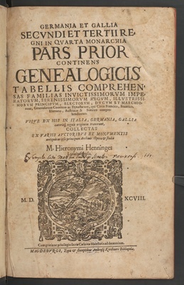 Enth.: Tomus I (Genealogicarum tabellarum continens illustrissimas familias patriarcharum qui ante et post Diluvium vixerunt ...), T. II (Genealogicarum tabellarum continens I. Paralipomena Primi Tomi ...) und - T. III (Genealogicarum tabellarum continens Graecorum Principium Familias, Ionicas, Aeolicas, Doricas ...)