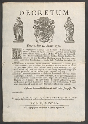 18/232 - Dekret über das Verbot und die Verurteilung der "Tractiuncula de fontibus iuris canonici Germanici" des Mainzer Universitätsprofessors Johann Baptist Horix durch die Heilige Römische und Universale Inquisition in Rom