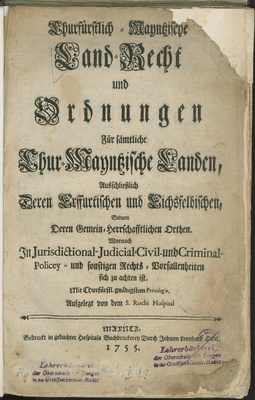 Churfürstlich-Mayntzische Land-Recht und Ordnungen Für sämtliche Chur-Mayntzische Landen, Ausschließlich Deren Erffurtischen und Eichsfeldischen, Sodann Deren Gemein-Herrschafftlichen Orthen : Wornach in Jurisdictional-, Judicial-, Civil- und Criminal-Policey- und sonstigen Rechts-Vorfallenheiten sich zu achten ist