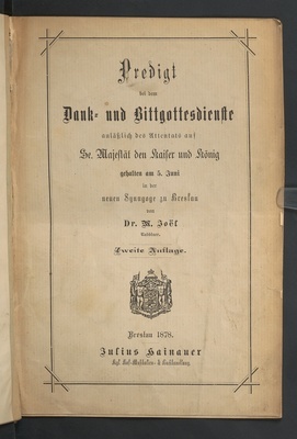 Predigt bei dem Dank- und Bittgottesdienste anläßlich des Attentats auf Se. Majestät den Kaiser und König : gehalten am 5. Juni in der neuen Synagoge zu Breslau / von Dr. M. Joël, Rabbiner
