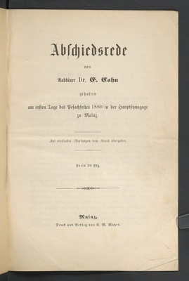 Abschiedsrede gehalten am ersten Tage des Pesachfestes 1880 in der Hauptsynagoge zu Mainz / von Rabbiner Dr. E. Cahn