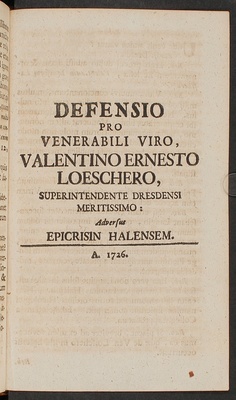 Defensio Pro Venerabili Viro, Valentino Ernesto Loeschero, Superintendente Dresdensi Meritissimo: Adversus Epicrisin Halensem
