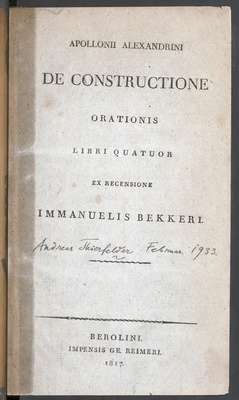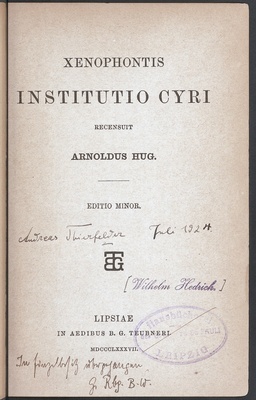 D. Dissertationes sind Aufzeichnungen Arrians von Vorlesungen Epiktets. - Text griech. in griech. Schr. u. lat. - Vorlageform d. Erscheinungsvermerks: Basileae, Per Ioannem Oporinum. - Kolophon: Anno ... M.D.LIIII. Mense Martio. - Bibliogr. Nachweis: VD16 A 3793. - Einheitssacht. d. beigef. Werks: Enchiridion