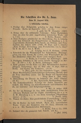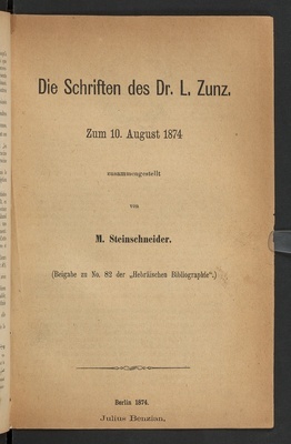 Die Schriften des Dr. L. Zunz : zum 10. August 1874 / zusammengestellt von M. Steinschneider