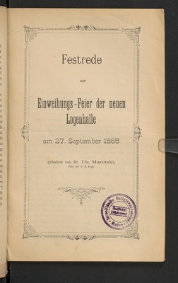 Festrede zur Einweihungs-Feier der neuen Logenhalle am 27. September 1885 / gehalten von Br. Dr. Maretzki, Präs. der D. R. Loge