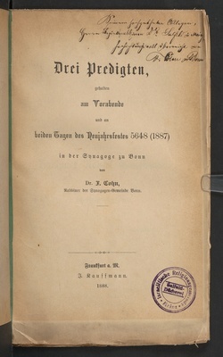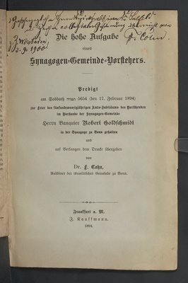 Die hohe Aufgabe eines Synagogen-Gemeinde-Vorstehers : Predigt am Sabbath Tezawe 5654 (den 17. Februar 1894) zur Feier des fünfundzwanzigjährigen Amts-Jubiläums des Vorsitzenden im Vorstande der Synagogen-Gemeinde Herrn Banquier Robert Goldschmidt in der Synagoge Bonn / gehalten und auf Verlangen dem Drucke übergeben von Dr. F. Cohn (Rabbiner der israelitischen Gemeinde zu Bonn)