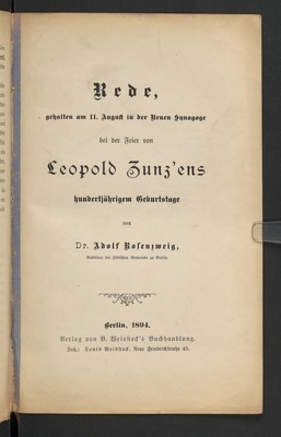 Rede, gehalten am 11. August in der Neuen Synagoge bei der Feier von Leopold Zunz'ens hundertjährigem Geburtstage / von Dr. Adolf Rosenzweig (Rabbiner der jüdischen Gemeinde in Berlin)