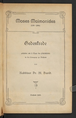 Moses Maimonides (1135-1204) : Gedenkrede : gehalten am 2. Tage des Passahfestes in der Synagoge zu Bochum / von Rabbiner Dr. M. David