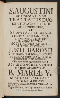 S. Augustini Hipponensis Episcopi Tractatus Duo De Utilitate Credendi Ad Honoratum, Et De Unitate Ecclesiæ Contra Petiliani Constantinensis Episcopi Donatistæ Epistolam, / Notis Atque Analysi Illustrati Studio Justi Baronii Veteracastrensis, Ss. Th. Et J. U. D. Illustrissimo Archiepiscopo Moguntino á Consiliis (De quo vide appendicem libri) Almæ Congregationi Majori Academicæ B. Mariæ V. Ab Angelo Salutatæ In Xenium Oblati Moguntiæ, A. Domini MDCCLXIV.