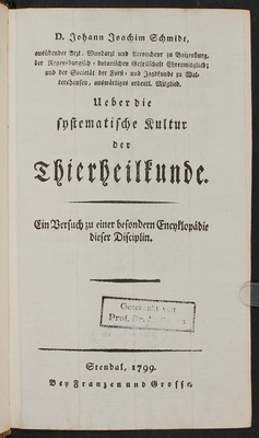 D. Johann Joachim Schmidt, ausübender Arzt, Wundarzt und Accoucheur zu Boizenburg, der Regensburgisch-botanischen Gesellschaft Ehrenmitglied; und der Societät der Forst- und Jagdkunde zu Waltershausen, auswärtiges ordentl. Mitglied. Ueber die systematische Kultur der Thierheilkunde : ein Versuch zu einer besondern Encyklopädie dieser Disciplin