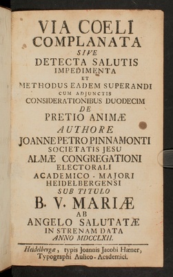Via Coeli Complanata Sive Detecta Salutis Impedimenta Et Methodus Eadem Superandi Cum Adjunctis Considerationibus Duodecem De Pretio Animæ / Authore Joanne Petro Pinnamonti, Societatis Jesu, Almæ Congregationi Electorali Academico - Majori Heidelbergensi Sub Titulo B. V. Mariæ Ab Angelo Salutatæ In Strenam Data Anno MDCCLXII.