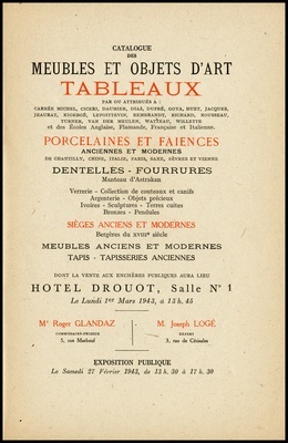 Catalogue des tableaux anciens par: Boilly, Brekelenkam, De Claeuw, ..., aquarelle, pastel, objets d'art et d'ameublement principalement du XVIIIe siècle : bronzes, pendules, sculpture, faïence, sièges et meubles, ameublement de salon recouvert de tapisserie ancienne, tapisseries anciennes; appartenant à divers amateurs; et dont la vente aux enchères publiques aura lieu à Paris, Galerie Jean Charpentier, le lundi 22 mai 1933 / Commissaire-Priseur: Maurice Ader