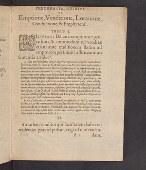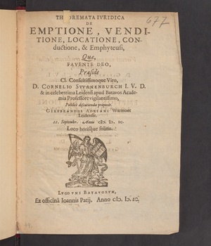 Theoremata Ivridica De Emptione, Venditione, Locatione, Conductione, & Emphyteusi / Quæ .... Cornelio Swanenburch ... publice discutienda proponit. Gerebrandus Adriani Warmont Leidensis. 22. Septembr. Anno M.D.IC. Loco horisque solitis.