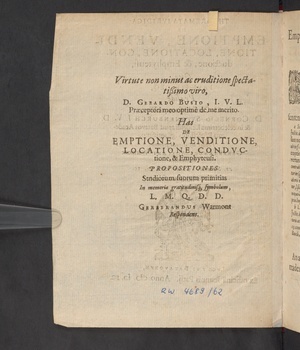 Theoremata Ivridica De Emptione, Venditione, Locatione, Conductione, & Emphyteusi / Quæ .... Cornelio Swanenburch ... publice discutienda proponit. Gerebrandus Adriani Warmont Leidensis. 22. Septembr. Anno M.D.IC. Loco horisque solitis.