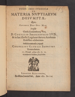 Positiones Ivridicæ Ex Materia Nvptiarvm Desvmptæ / Præside Cornelio Swanenburgio ... proponit Cornelius Georgii Smoutius, Roterodamus. VI. Novem. Anno M.D.IC.