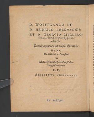 Theses De Donationibvs / Quas, Præside ... D. Paulo Graseccio ... defendere conabitur, Mense Februario, Benedictus Isenbeccius, Ratisbonensis.
