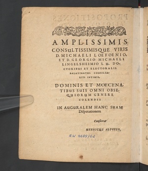 Propositiones Aliqvot Controversi Juris / Quas... Præside ... D. Iulio Pacio Ic. ... Pro Obtinendis In utroqve Jure Doctoratus Privilegiis Et Insignibus. Publice pro virili tuebitur Henricus Altgelt Sigenensis Nassovius. In aula IC. Cal. Junij. horis solitis