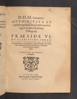 D.O.M.iuuante. AVTHORITATE ET consensu amplißimi Iurisconsultorum Collegij in inclyta Academia Tubingensi, PRAESIDE ... IOHAN. HALBRITTERO, I.V.D.AD SEQVENtes propositiones ex materia L. si quis arbitratu 42.D.de verb.oblig.deductas, in Aula noua, 19. Nouemb. hora consueta respondebit LVDOVICVS BVRRERVS Vaihingensis.