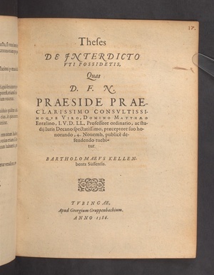 Theses DE JNTERDICTO VTI POSSIDETIS, Quas D.F.N. PRAESIDE ... DOMINO MATTHAEO Entzlino, I.V.D.LL. Professore ordinario, ac studij Iuris Decano spectatissimo ... 4. Nouemb. publicè de fendendo tuebitur BARTHOLOMAEVS KELLENbentz Süssensis.