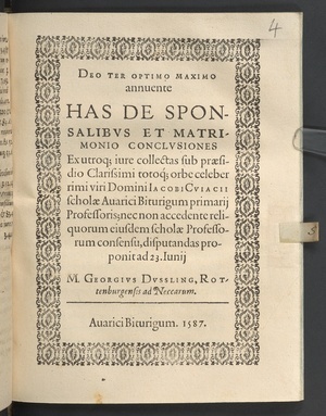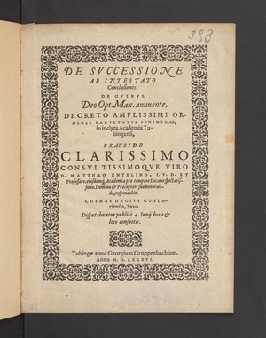 De in integrum restitutione minorum,Conclusiones. ... PRAESIDE ... IOANNE HOCHMANNO, I.V.Doctore, et Iuris Canonici in inclyta Tubingensi Academia Professore ... ad subsequentes cum quaestione conclusiones et appendices, 9.Septemb. hora 6.in auditorio IC.respondebit, M.IOHANNES BIDENbach Bebenhusanus.