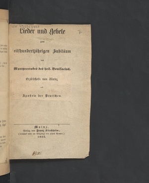 Bruderschaft des heiligen Johannis von Nepomuk, glorreichen Martyrers, mächtigen Schutzpatronen und vollkommenen Musters der Liebe Gottes und des Nächsten. : Errichtet in der Erzhohen Domkirche zu Mainz.