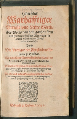 Frankfurt und Leipzig sind Messeorte. Johann Nikolaus Andreae druckte in Herborn (Herborn wird in 3. Blatt von hinten = 9. ungezählte Seite hinten "Verzeichnüß derer Bücher..." genannt)