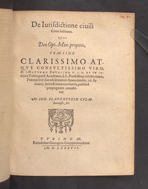 De Iurisdictione ciuili Conclusiones. QVAS ... PRAESIDE ... D.MATTHAEO ENTZLINO V.I.D. ET IN INclyta Tubingensi Academia, LL.Professore celeberrimo, ... 20.Ianuarij, hora & loco consuetis, publice̢ propugnare conabitur M.IOH. FLADENSTEIN CVLMbacensis, Fr.