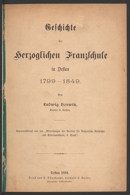 Die Emanzipation der Juden in Anhalt-Dessau : aktenmäßige Darstellung / von L. Horwitz, Kantor und Lehrer in Dessau