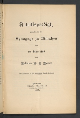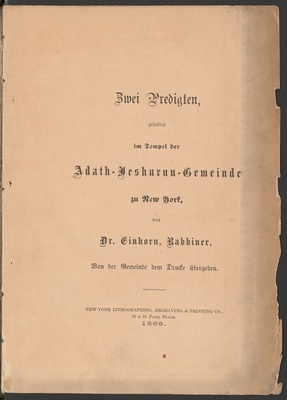 Zwei Probepredigten, gehalten in der Synagoge zu Darmstadt / von A. Treuenfel (Bezirks-Rabbiner zu Weilburg) u. Julius Landsberger (Rabbiner zu Posen)