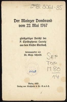 Der Mainzer Dombrand vom 22. Mai 1767 / gleichzeitiger Bericht des Christopherus Lacroix ; herausgegeben von Aloys Schmidt