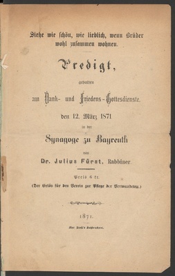 Siehe wie schön, wie lieblich, wenn Brüder wohl zusammen wohnen : Predigt, gehalten am Dank- und Friedens-Gottesdienste, den 12. März 1871 in der Synagoge zu Bayreuth / von Dr. Julius Fürst, Rabbiner