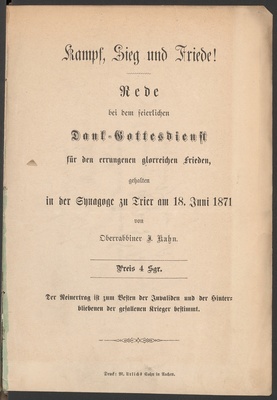 Kampf, Sieg und Friede! : Rede bei dem feierlichen Dank-Gottesdienst für den errungenen glorreichen Frieden, gehalten in der Synagoge zu Trier am 18. Juni 1871 / von Oberrabbiner J. Kahn