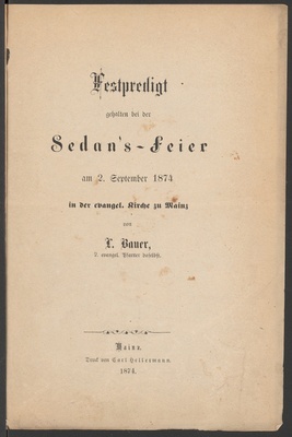 Festpredigt gehalten bei der Sedan's-Feier am 2. September 1874 in der evangel. Kirche zu Mainz / von L. Bauer