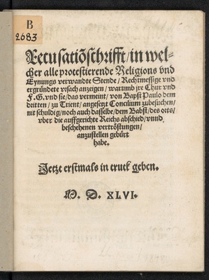 Recusatio[n]schrifft, in welcher alle protestierenden Religions und Eynungs verwandte Stende rechtmessige und ergründete Ursach anzeigen, warumb ire Chur... : das vermeint von Bapst Paulo III. zu Trient angesetzt Concilium zubesuchen nit schuldig noch auch dasselbe dem Bapst des orts uber die auffgerichte Reichsabschied unnd beschehenen Vertröstungen auszustellen gebürt habe