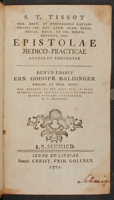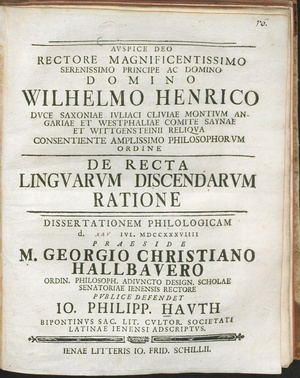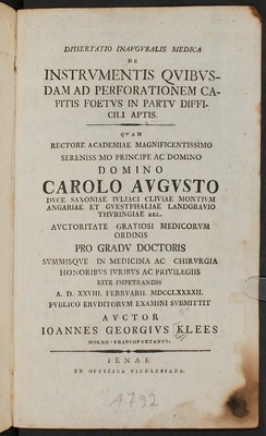Vorlageform der Veröffentlichungsangabe: "Ienae Dypis Fiedleri, A.D. XVIII. Martii MDCCLXXXVII"